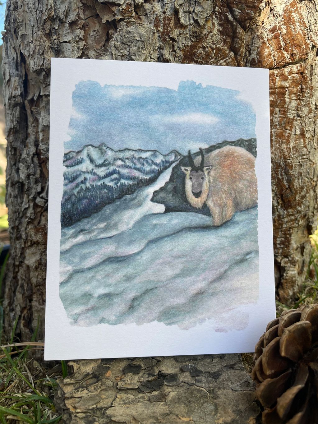 Inspired by a moment in time on the ski slopes, a mountain goat taking in a spectacular view!